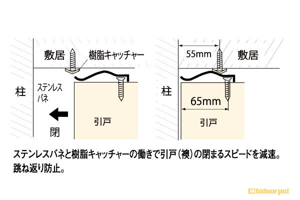 ステンレスバネと樹脂キャッチャーの働きで引戸(襖)の閉まるスピードを減速。跳ね返り防止にも役立ちます。鴨居と引戸の隙間(チリ)が広い場合には、調節プレートをご使用ください。