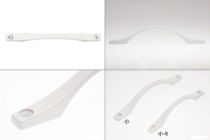 スリムで安価な定番製品で、表面処理は美しい艶消しの焼付け白塗装。表からのビス止め式なので取り付けが簡単です。