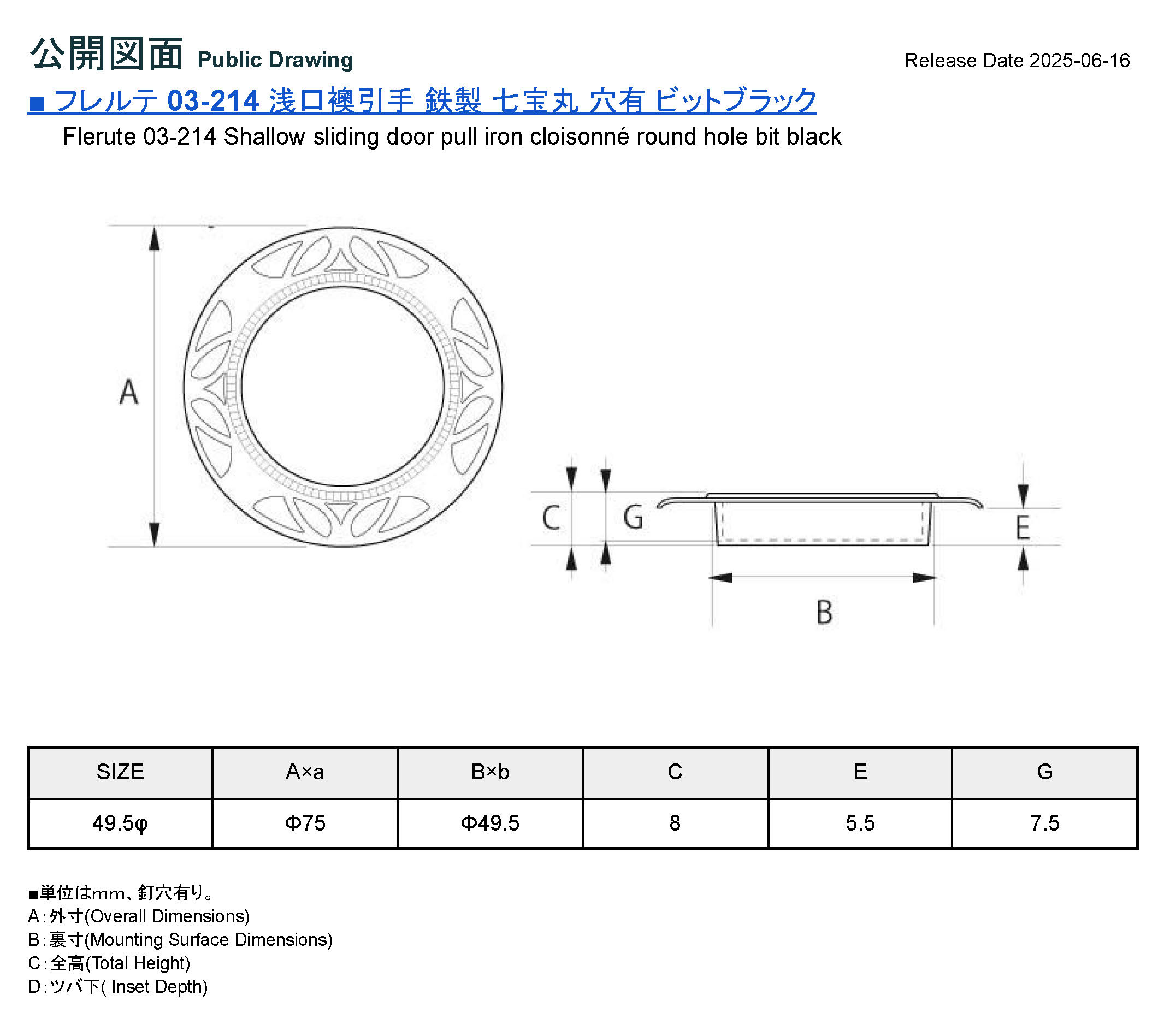 フレルテ 03‐214 浅口襖引手 鉄製 七宝丸 穴有 ビットブラック