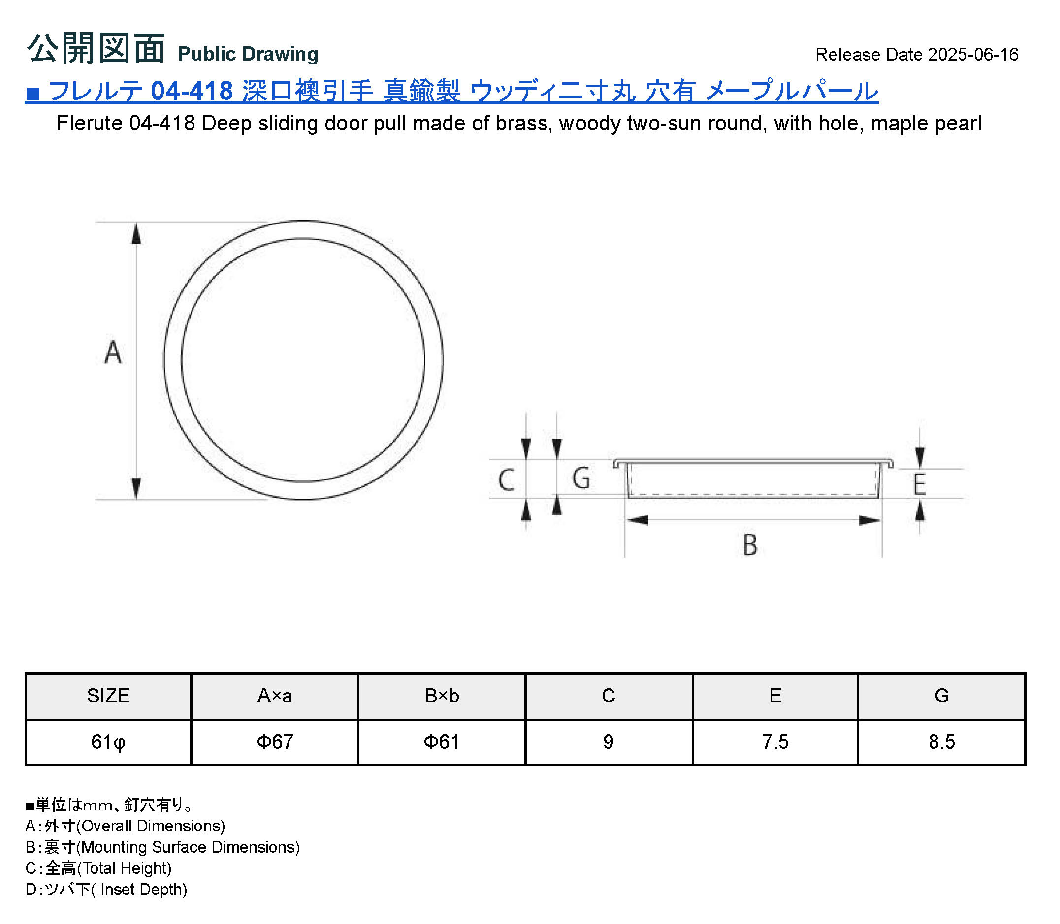 フレルテ 04‐418 深口襖引手 真鍮製 ウッディ二寸丸 穴有 メープルパール