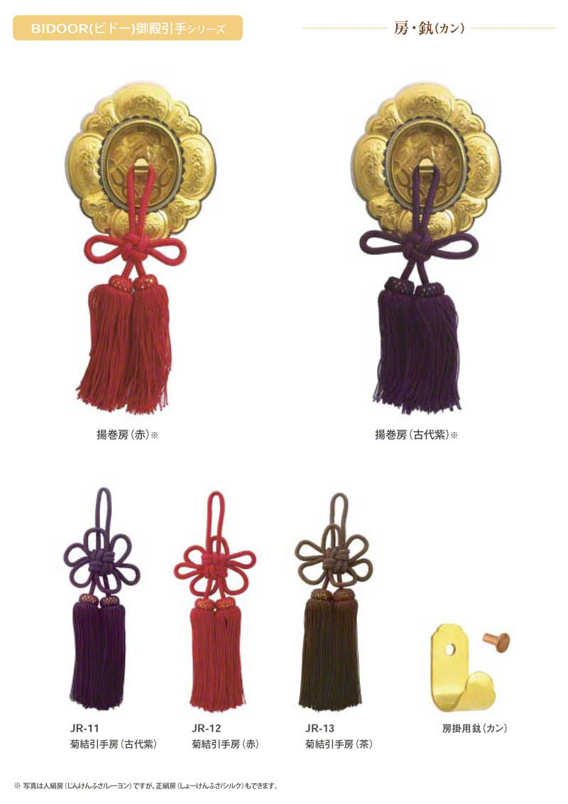 御殿引手の中央に、房用の「かん」というフック金物を付け、引手房をぶら下げる装飾もよく施されます。引手房は一般的に揚巻(あげまき)結びのものが使われますが、さらに豪華な菊結び房も取付けることができます。房付をご希望の方はお問い合わせください。