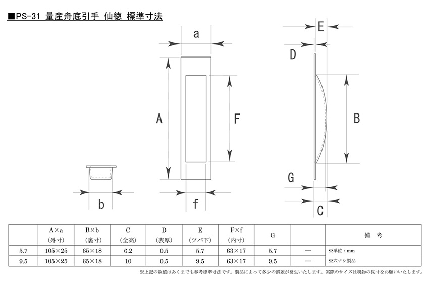 建具・戸襖用の定番舟底引手(横引き用)。釘穴なし。