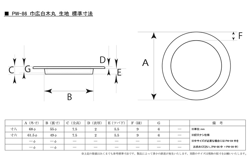 尚、この製品に中サイズをお求めの場合には、PW-04 白木丸の中サイズ(裏寸は約43Ф)をお選びください。(PW-04の中=PW-86の中となります)