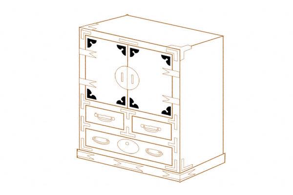 本格的な伝統民芸箪笥にも定番として使用されている和家具の装飾金物シリーズです。黄銅(真鍮)鋳物にツヤ有りの焼き付け黒色塗装を施しており、黄銅(真鍮)鋳物が創り出すその立体感ある模様は、民芸家具ならではの落ち着いた風合いや質の高さをより際立たせます。