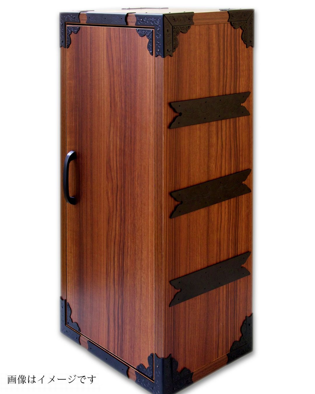 「オリエントシリーズ」は、伝統的な民芸家具の風合いを手軽に取り入れられる装飾金物です。縁起が良いとされる唐草模様の掘り込み装飾が施されており、表面はツヤを70%抑えた焼付け黒色塗装で仕上げられています。細部にまでこだわった落ち着いた質感が、和の空間に自然と調和します。