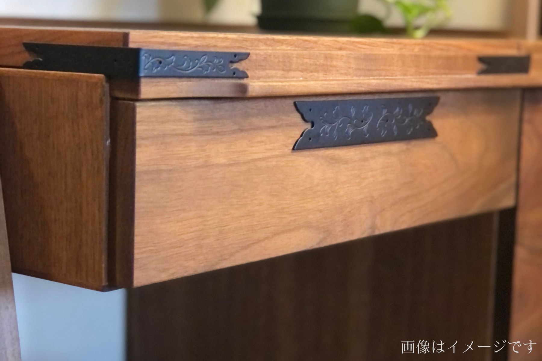 「オリエントシリーズ」は、伝統的な民芸家具の風合いを手軽に取り入れられる装飾金物です。縁起が良いとされる唐草模様の掘り込み装飾が施されており、表面はツヤを70%抑えた焼付け黒色塗装で仕上げられています。細部にまでこだわった落ち着いた質感が、和の空間に自然と調和します。