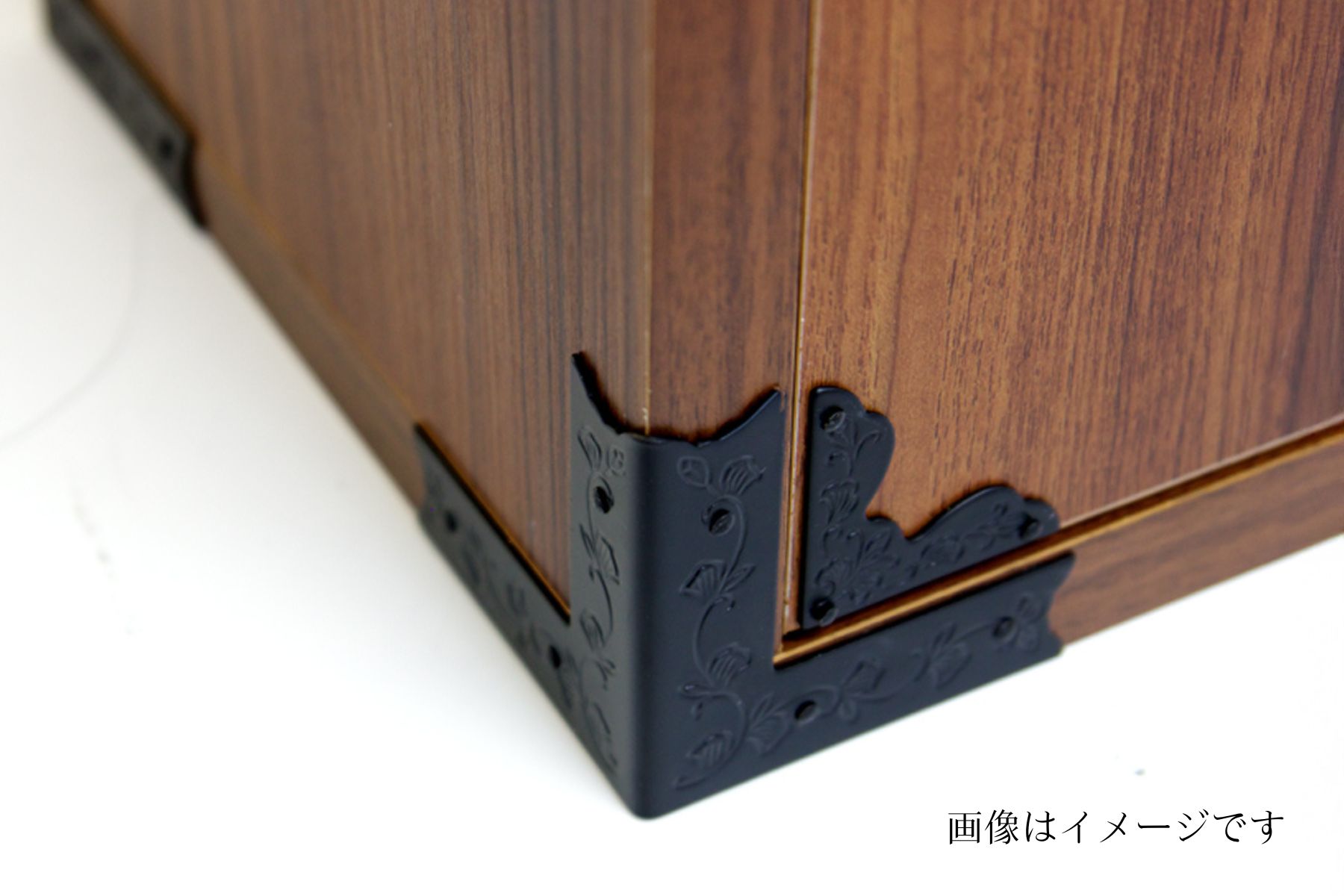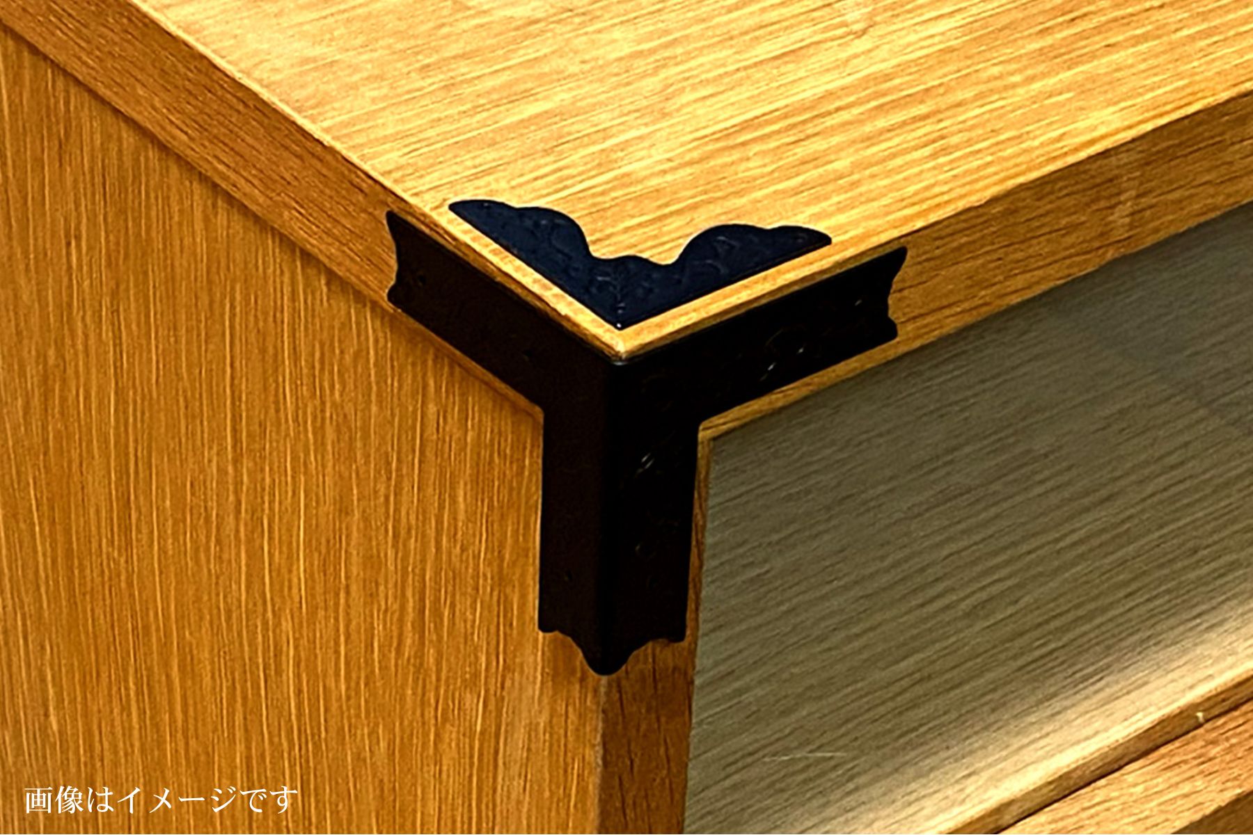 「オリエントシリーズ」は、伝統的な民芸家具の風合いを手軽に取り入れられる装飾金物です。縁起が良いとされる唐草模様の掘り込み装飾が施されており、表面はツヤを70%抑えた焼付け黒色塗装で仕上げられています。細部にまでこだわった落ち着いた質感が、和の空間に自然と調和します。